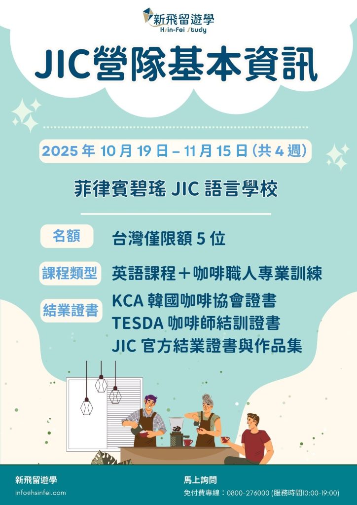 2025 JIC菲律賓碧瑤成人冬令營—英語+咖啡師專業訓練全新體驗 如果你熱愛咖啡,想在假期中不只是「學一技之長」,而是全身心浸入咖啡的世界——JIC 菲律賓碧瑤冬令營,正是為你準備的旅程。不只是學做咖啡,更是一段用英語開啟的咖啡師養成之路。 從咖啡歷史、豆種認識、手沖與義式拉花技巧,到品牌經營與商業模式,每一步都結合實作與語言訓練,讓你同時提升專業力、拓展國際視野。 營期間,不只可以親訪咖啡農場、參加咖啡師交流,還能在 San Juan 體驗衝浪的自由。在碧瑤山城的清新空氣裡,一邊練習英文,一邊玩咖啡、玩創意——讓學習成為一場有香氣、有故事的冒險。 快速瀏覽 Add a header to begin generating the table of contents 為什麼選擇碧瑤? 碧瑤(Baguio)位於呂宋島北部高地,平均氣溫約 20 度,涼爽舒適,被譽為菲律賓的「夏都」。這座城市以群山環繞、松林遍布的景色聞名,生活機能完整,同時保有安靜悠閒的氛圍。碧瑤是當地知名的教育重鎮,聚集了多所大學與語言學校,治安良好、文化氛圍濃厚。在這裡,不僅能專注學習,還能透過週末活動探索咖啡產地與自然風光,體驗不同於都會或海島的另一種菲律賓風情。 JIC海外營隊亮點 咖啡+英語雙技能:學習咖啡職人技能的同時,也能學到更生活化的英語!沉浸式體驗:從咖啡農場參訪到 OJT(咖啡館實習),課程與實務結合結業認證:韓國咖啡協會(KCA)、TESDA 咖啡師證書+JIC 官方證書獨特假日活動:咖啡師比賽、衝浪挑戰、文化探索名額超限量:台灣僅收 5 位學生,學習保證高互動、高品質 JIC海外營隊基本資訊 地點菲律賓碧瑤 JIC 語言學校時間2025 年 10 月 19 日 – 11 月 15 日(共 4 週)2025 年 11 月 16 日 – 12 月 12 日(共 4 週)2025 年 12 月 14 日 – 2026 年1 月 6 日(共 4 週)名額台灣限額 5 位課程類型英語強化課程+咖啡職人專業訓練結業證書KCA 韓國咖啡協會證書TESDA 咖啡師結訓證書JIC 官方結業證書與作品集 每日課程表 時段課程內容上午1:1 英語課程 3 堂(口說、閱讀、寫作)下午團體咖啡課 3 堂(沖煮技巧、拉花藝術、杯測練習、風味評級)晚間團體咖啡商業課 1 堂(品牌經營、菜單設計、行銷策略)晚間選修選修課 2 堂(Zumba、電影欣賞、唱歌、素描等) 咖啡訓練 第 1 週:咖啡歷史、豆子處理、沖煮方法第 2 週:義式萃取、咖啡機操作、奶泡製作、拉花入門第 3 週:創意菜單、咖啡分級、杯測技巧第 4 週:實作測驗、作品集完成、畢業發表 咖啡商業課程 第 1 週:產業趨勢、菜單設計、客群分析第 2 週:定價策略、服務流程、品牌經營第 3 週:行銷策略、社群經營、包裝設計第 4 週:投資提案與咖啡專案發表 英語課程 一對一課程 3 節:口說訓練+閱讀理解+寫作技巧團體課互動:討論與簡報咖啡主題 週末特別活動 咖啡農場體驗:參與採收、烘乾、杯測合作咖啡館實習(第 2–4 週週日):體驗真實咖啡廳生活節奏海邊衝浪+團隊合作遊戲 營隊重點日期與活動 10/20、11/17、12/15:分級測驗+說明會10/25、11/22、12/20:咖啡農場參訪(Benguet)11/1、11/29、12/27:San Juan 衝浪體驗+團隊挑戰11/8、12/6、1/3:咖啡師小型比賽11/14、12/12、1/9:畢業典禮+作品發表 JIC營隊住宿選擇 營隊提供兩種住宿選擇:宿舍 1(單人/雙人/四人房):加大床、陽台、獨立衛浴、冰箱、書桌、餐桌,山景或花園景宿舍 2(共享空間):大型房間含 2–3 間臥室,公用衛浴與餐廳;臥室配備上下舖、衣櫃、冰箱、電扇、書桌 JIC營隊適合對象 想要語言+專業技能的雙重學習熱愛咖啡文化、夢想成為咖啡師或創業者希望在海外生活冒險+全英語環境 認識JIC碧瑤語言學校 JIC(Japan International Cultural Exchange)創立於 2002 年,是最早成立的日系語言學校之一,擁有超過 20 年的專業教學經驗。學校特色:專業英語師資:以一對一課程聞名,專注口說與實用英語。跨文化學生組合:學生來自日本、韓國、台灣及東南亞,學習同時建立國際人脈。安全校園與舒適宿舍:校園環境寧靜、設備完善,提供單人到多人房的多樣選擇。課程多元:除傳統英語教學課程外,JIC 也開設商業英文、考試課程,並首創英語+咖啡職人雙技能培訓。 JIC 的教育理念是「Language + Life」強調英語學習必須與生活經驗連結,這正是咖啡主題冬令營的核心精神! JIC 菲律賓碧瑤冬令營,為熱愛咖啡、想深入體驗職人精神的你而設!這不只是咖啡培訓課程,而是一場結合英語交流、創意實作與品牌思維的沉浸式學習旅程。要不要一起在閑靜舒適與熱鬧兼具的碧瑤山城中,磨練技藝、拓展視野,從咖啡愛好者邁向專業咖啡師呢? 2025 咖啡培訓+行銷成人營名額超級有限,立即填表報名,掌握碧瑤冬令營的最新資訊,開啟屬於你的咖啡冒險❤️ Please enable JavaScript in your browser to complete this form.Please enable JavaScript in your browser to complete this form.姓名 *手機號碼 *LINE IDEmail電子信箱 *居住地區 *請選擇新竹市新竹縣臺北市新北市基隆市桃園市宜蘭縣臺中市苗栗縣彰化縣南投縣雲林縣高雄市臺南市嘉義市嘉義縣屏東縣澎湖縣花蓮縣臺東縣金門縣連江縣國外地區有興趣課程?海外咖啡師專案課程咖啡廳創業課程義式拉花大師課程精品手沖大師課程咖啡感官風味課程其他如何認識我們?IG/FB展覽廣告/DM來過咖啡廳朋友介紹新飛舊生其他諮詢內容送出